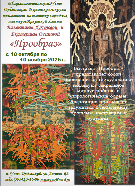 Завтра, 10 октября в Национальном музее в 11. 00 ч в большом выставочном зале состоится открытие выставки "Прообраз" произведений двух самобытных художников, Народных мастеров Иркутской области: Ажуновой Валентины Викторовны и Осиповой Екатерины Викторовны.