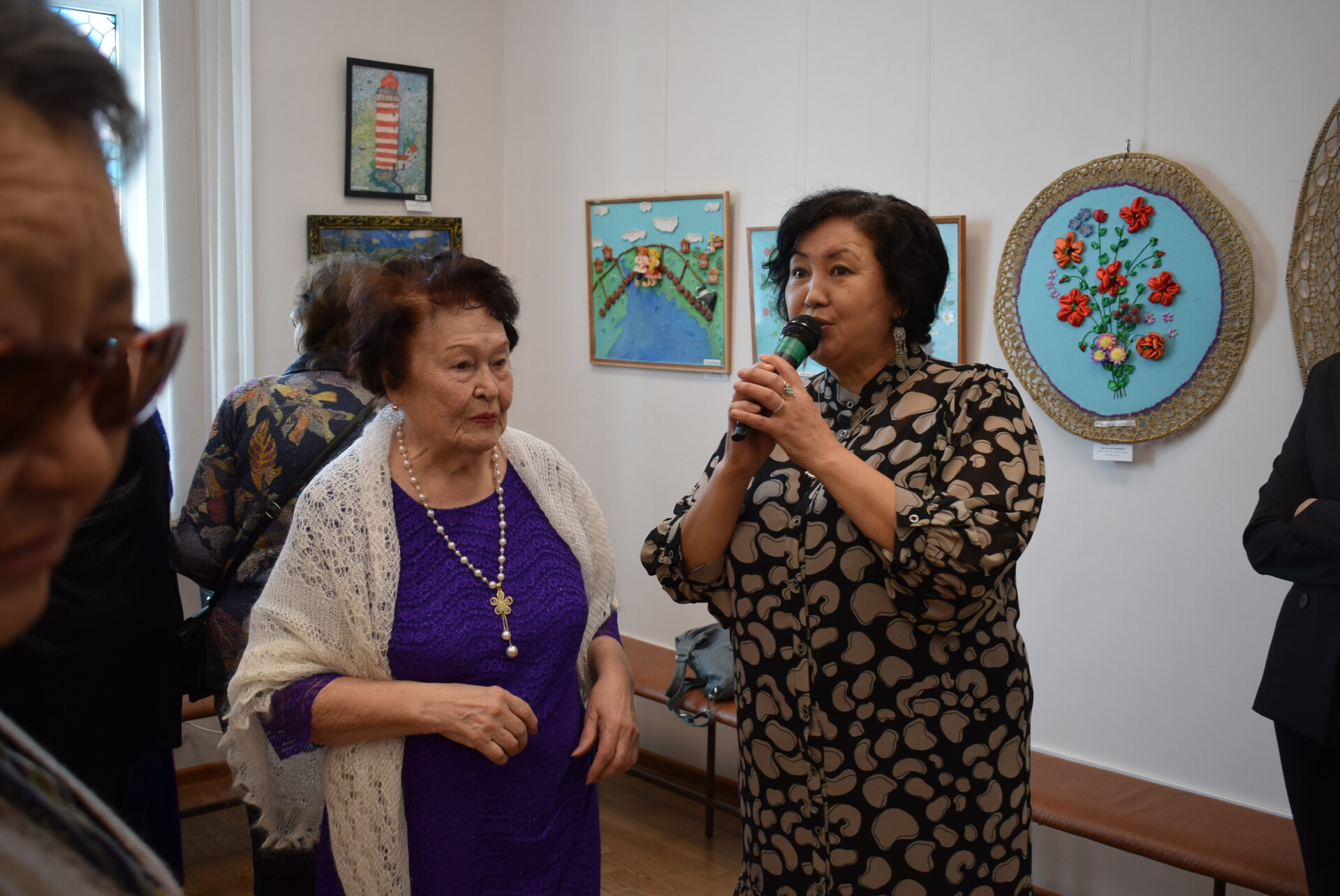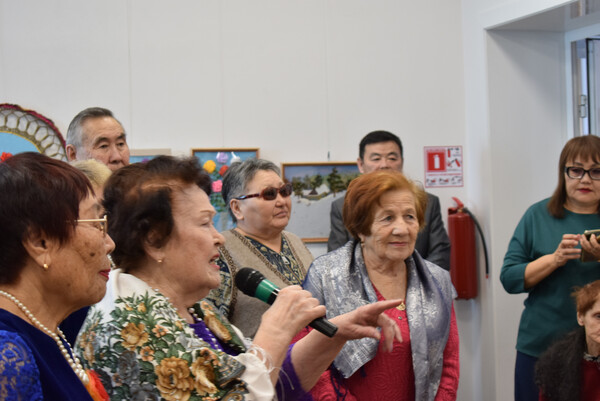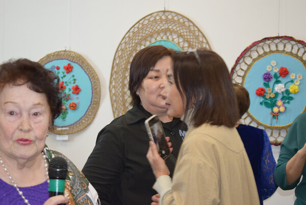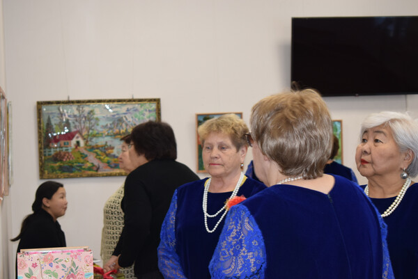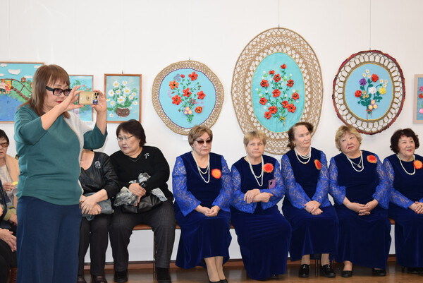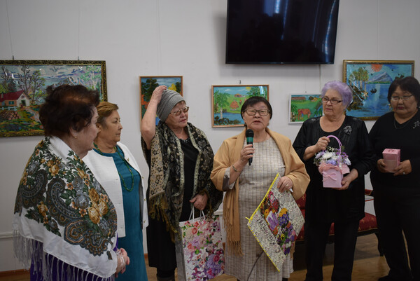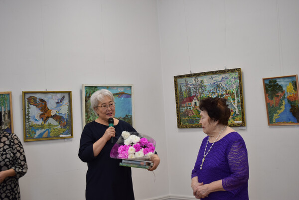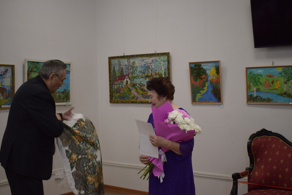 Юбиляр в свою очередь отметила свой день рождения новой персональной выставкой "Творение добрых рук". Ведущая мероприятия Баршуева Зинаида Геннадьевна, заведующая отделом (сектором) представила гостям виновника торжества
