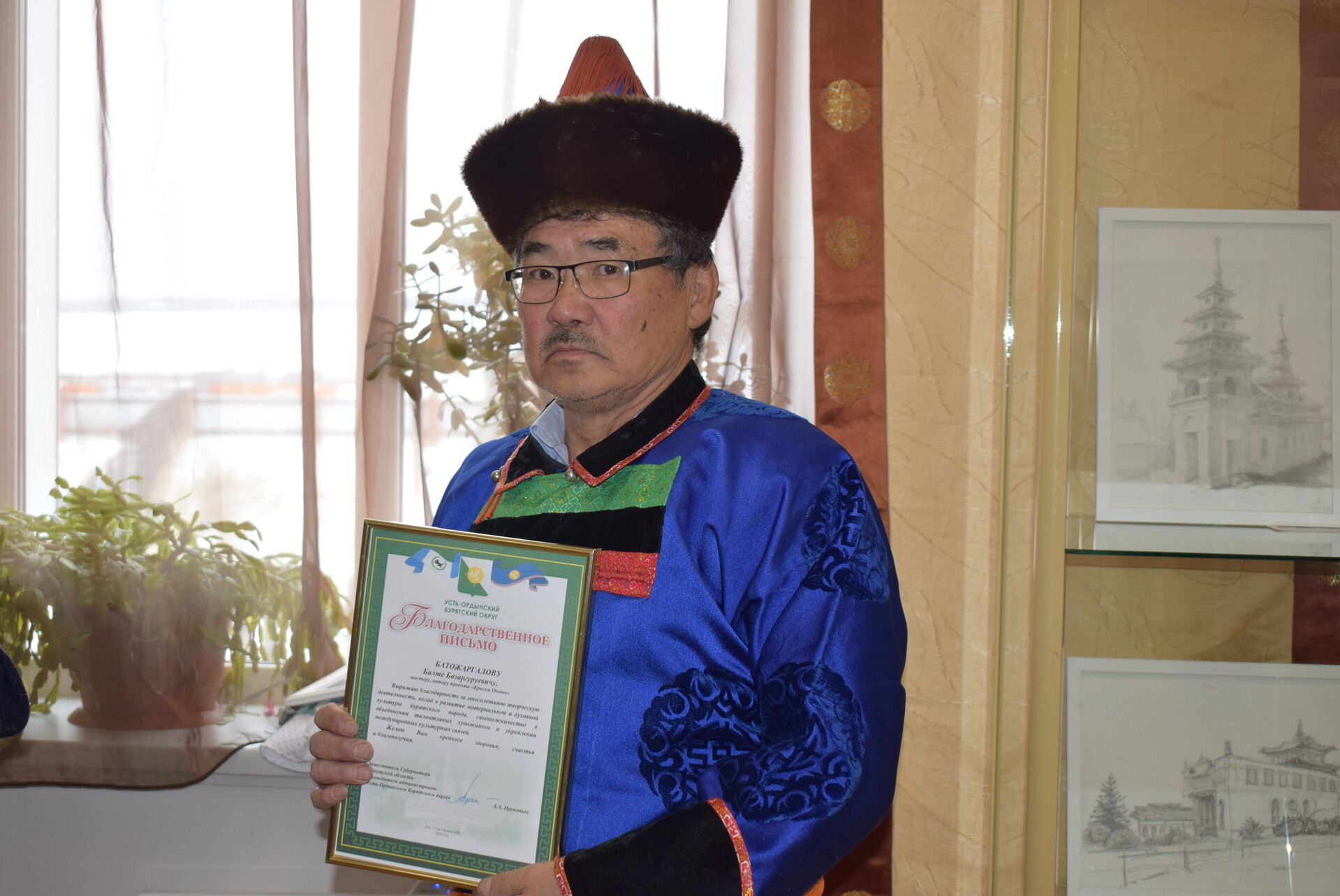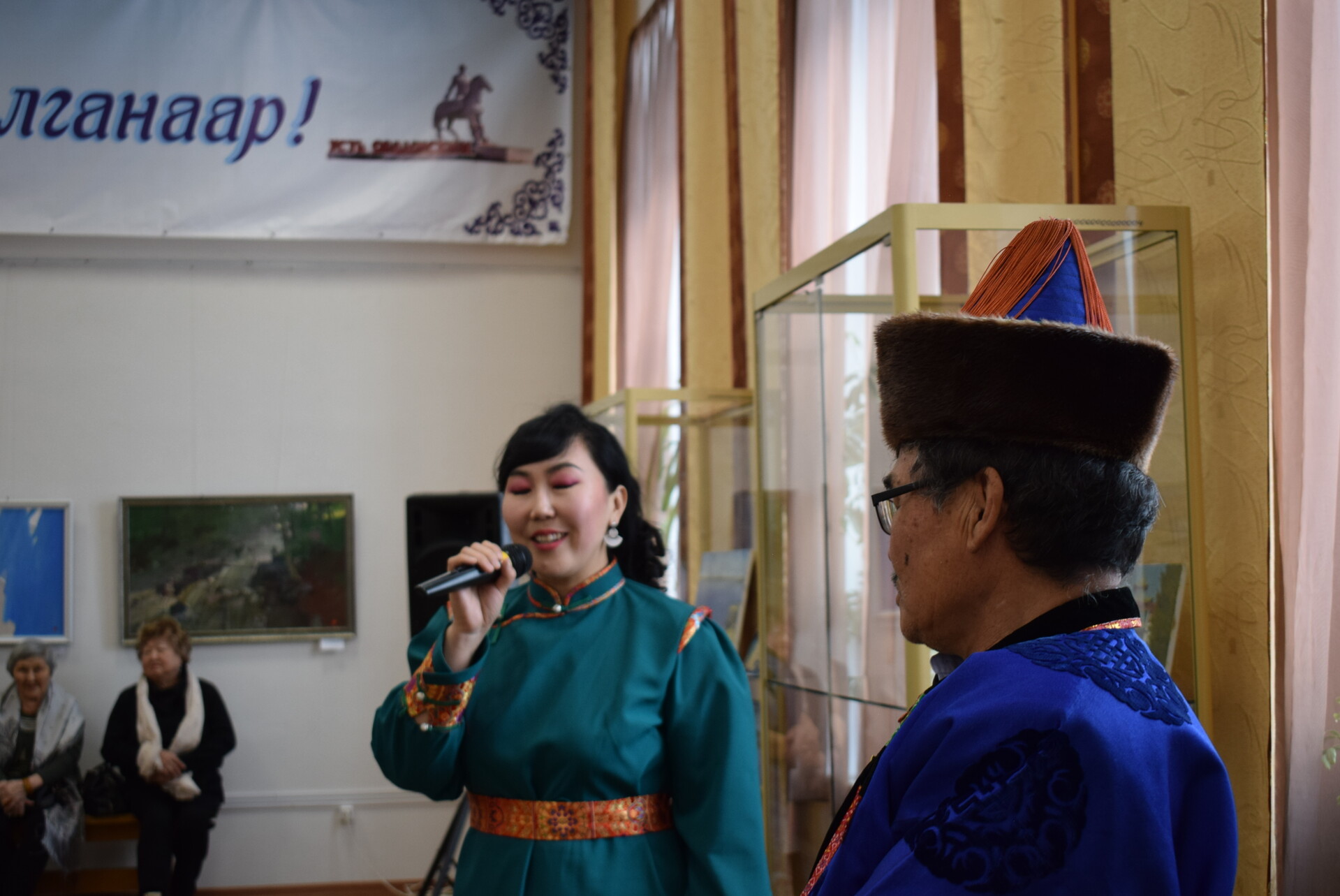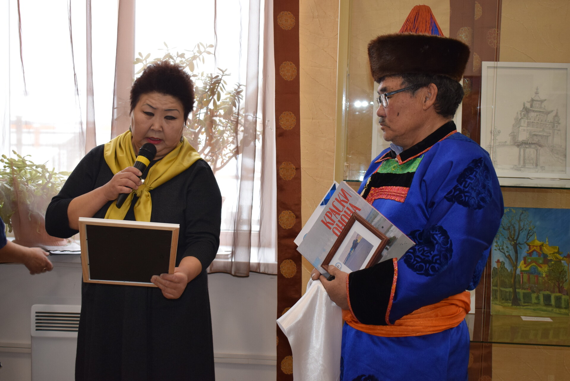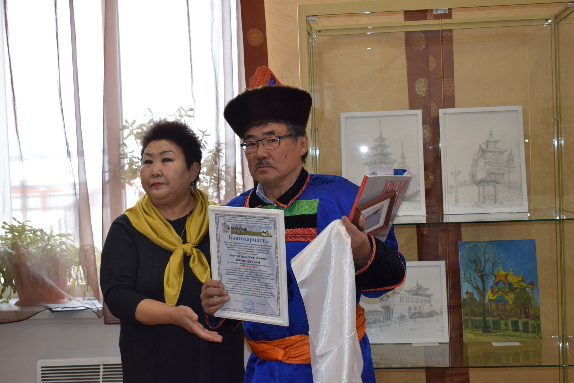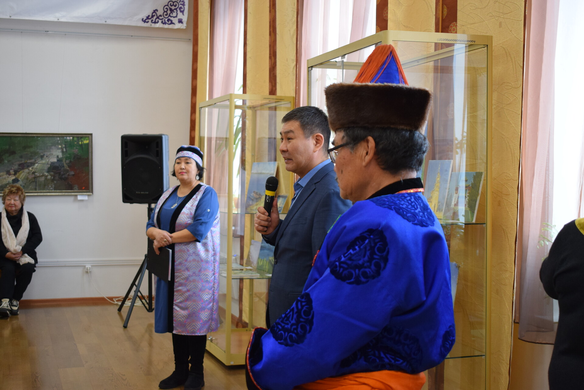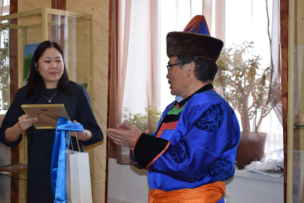 18 февраля в 11 ч. в большом выставочном зале Национального музея состоялось открытие международной выставки «Краски Онона». Ведущая мероприятия Зинаида Геннадьевна, заведующая отделом(сектором) ОГБУК "Музей УОБО" поздравила собравшихся гостей с наступившим праздником "Сагаалганом" и представила организатора выставки -Балта Базаргуруевича Батожаргалова